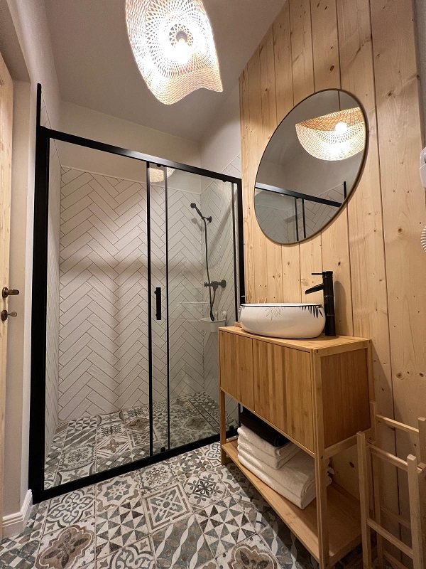 La etaj sunt două dormitoare cu pat king size (180x200) și 2 băi.